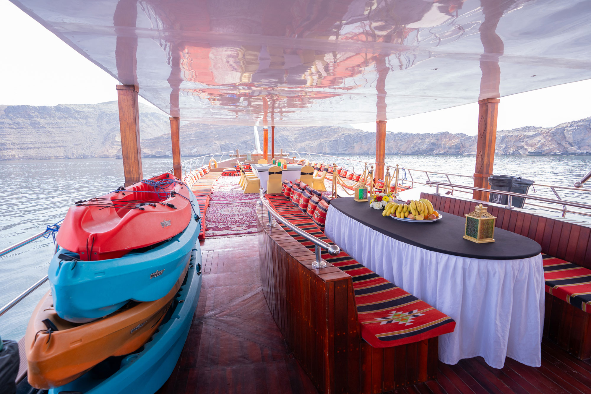 Musandam luxury cruise brings you an opportunity to experience the amazing pristine world in Musandam Oman like no other place on Earth, where fun and surprises come in waves. Spend your day sailing into the Musandam fjords on our luxury boat, watching dolphins, swimming, and snorkeling crystal-clear waters, and enjoy a live BBQ dinner.